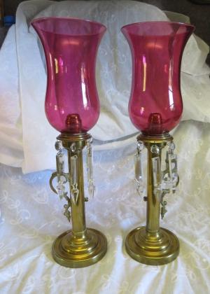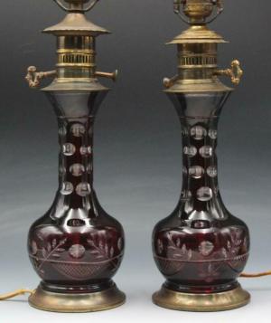 Pair Antique Bohemian Ruby Cut to Clear Glass Converted Oil Table Lamps