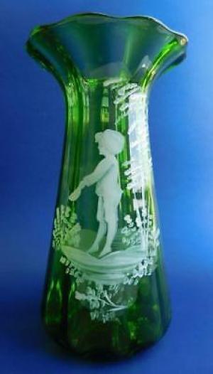 Antique Mary Gregroy Green Fluted Glass Vase Enamelled Boy Cap in Hands 1900s