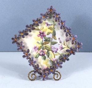 Antique Brass Victorian Enamel VIOLETS Flowers Miniature EASEL FRAME w Glass