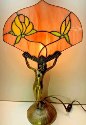 Art Deco Lady Lamp Stained Glass Tiffany Style Nymph Nude Table Fan Pink Yellow