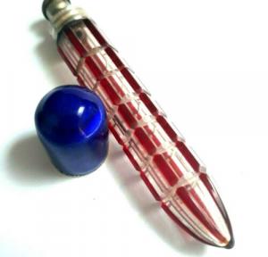 Deco Ruby Red Cut Glass & Sterling Blue Guilloche Lay Down Perfume Scent Bottle.