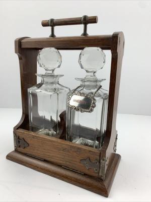 Antique English Oak Tantalus Brass Cut & Polished Glass Decanter Bottles