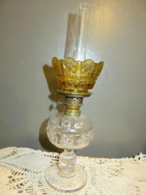 ANTIQUE VINTAGE MINIATURE OIL LAMP AMBER EAPG STARS & BARS W/ SHADE & CHIMNEY