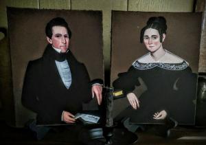 Antique 1830s Folk Art Primitive Watercolor Portrait Painting of Woman Knitting