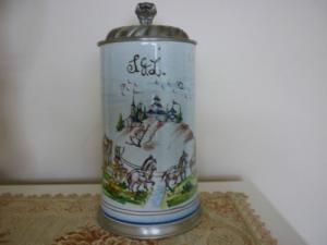 RARE! ANTIQUE BLUE DECORATED CROCK BEARDED MAN HANDLES