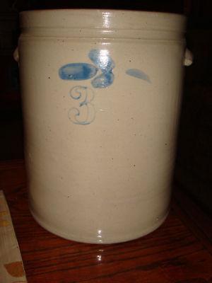 Antique Stoneware Salt Glaze Crock with Blue Flowers 3 Gallon