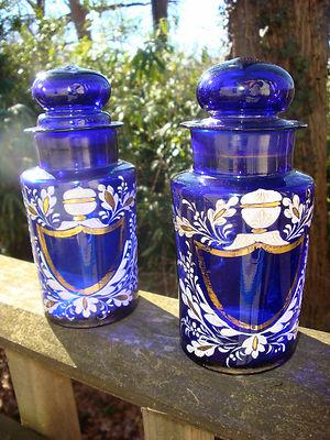 ANTIQUE COBALT & ENAMEL GLASS APOTHECARY BOTTLES JAR VANITY BOTTLES