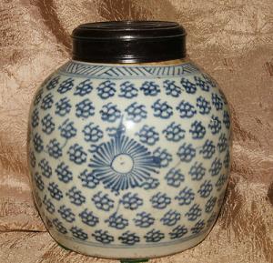 ANTIQUE CHINESE FLORAL BLUE AND WHITE WOODEN LID GINGER JAR