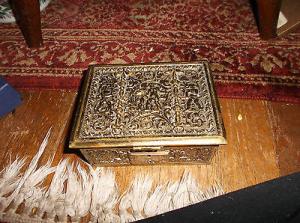 BRONZE AND BRASS TRINKET BOX W/ KEY / GERMANY/ CHERUBS 4'' X 5'' ANTIQUE NICE