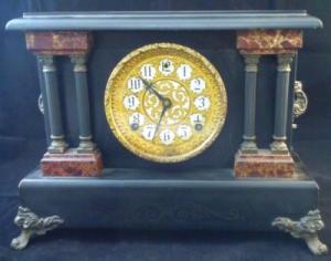 ANTIQUE SETH THOMAS ADAMANTINE MANTLE CLOCK W/COPPER COLUMNS & LIONS (No. 295)