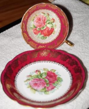 E B FOLEY BURGUNDY RED GOLD CABBAGE ROSES Teacup and saucer Mint condition