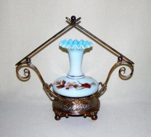 Antique Victorian Blue Art Glass Ruffled Edge Epergne Vase in Basket