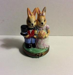 France Limoges Hand Painted Bunny Rabbit Wedding Couple Bottle GlassTrinket Box