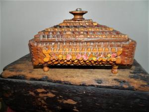 Exciting Antique Folk Art TRAMP ART Chip Carved Painted Jewelry Box