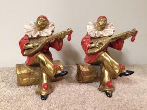 PAIR OF BRASS FRENCH CLOWNS JESTERS MUSICIANS WITH RUFFLED COLLARS BOOKENDS