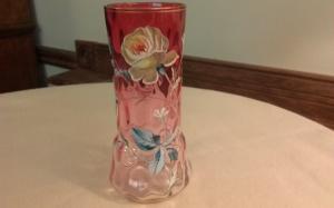 Antique Victorian Cranberry Thumbprint Hand Painted Enamel Vase Large Roses