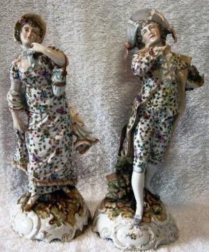 Two Early Volkstedt Dresden German Man & Woman Figures Figurine Hayfork Mark