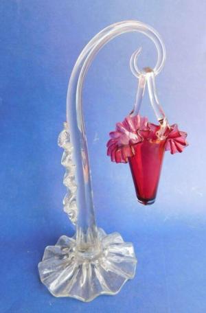 Superb Victorian English Art Glass Hanging Cranberry Basket Epergne Vase & Stand