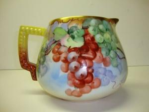 Antique Lemonade Pitcher, grapes, gooseberries, currants. Gold trim around edge