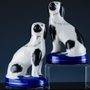 FINE PAIR ANTIQUE VICTORIAN STAFFORDSHIRE POTTERY BLACK WHITE ENAMEL DOG FIGURES