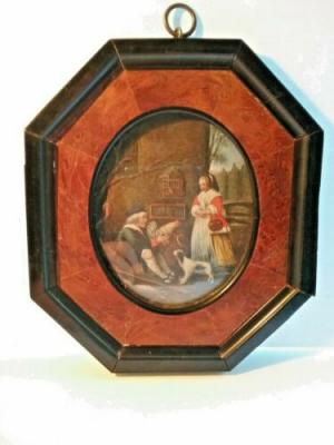 Antique MINIATURE PAINTING - Birdseye Veneer Frame - At The Marketplace - VGC