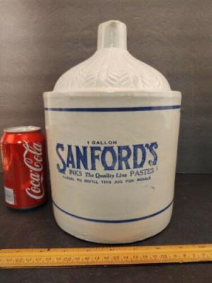 Vintage Sanford''s 1 Gallon Ink Jug w/ Spout Handle Blue White Stoneware