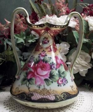 EARLY Hand Painted NIPPON JAPANESE VASE - ROSES & GOLD MORIAGE BEADING