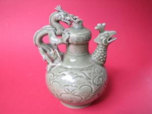 Vintage Chinese Celadon Pottery Cadogan Tea Pot with Dragon bottom fill