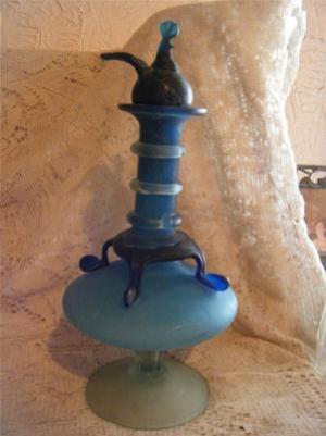 Vintage Hand-Crafted Blue Bohemain Art Glass Pedestal Decanter w/Rooster Stopper