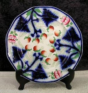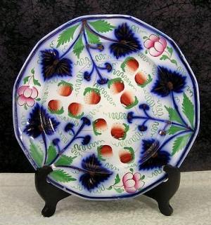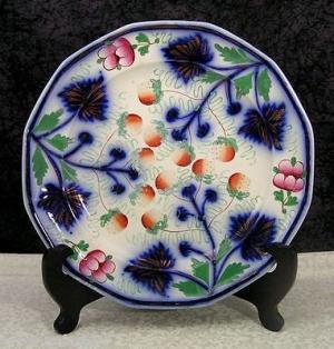 Antique Staffordshire Gaudy Ironstone Strawberry Flow Blue 9" Plate #1
