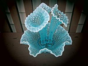 Vintage Fenton Hobnail Fluted Blue Glass Ruffled Bowl With 3 Horns - Great Shape