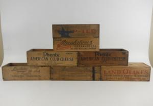 Lot (7) of Assorted Vintage Wooden Cheese Boxes- Phenix, Land O'Lakes, Mountaino