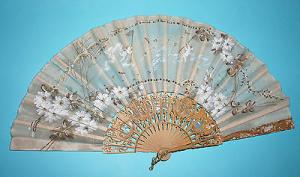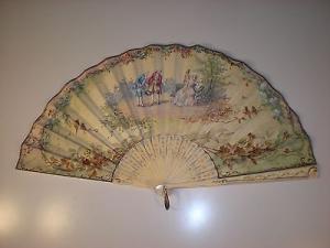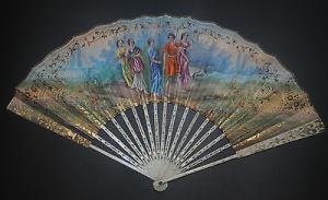 Antique French Hand Painted Fan With Cut & Handcarved MOP Mother of Pearl 1800's