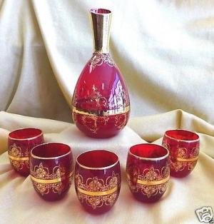 Murano Decanter and Glasses Glass Beautiful Red Gold Trim Wine Alcohol