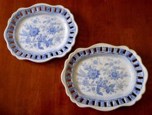 2 Antique Cut-Out 10 1/4" Cobalt Blue Floral Ceramic Transfer-ware China Plates