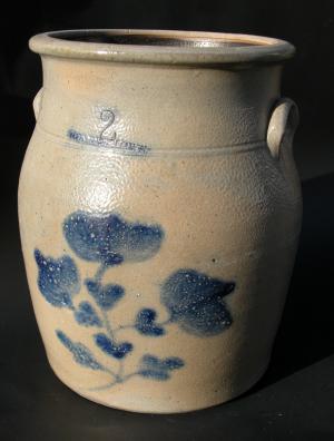 Antique CHARLESTOWN MA Stoneware OVOID Handled CROCK Floral COBALT Blue 2 GALLON