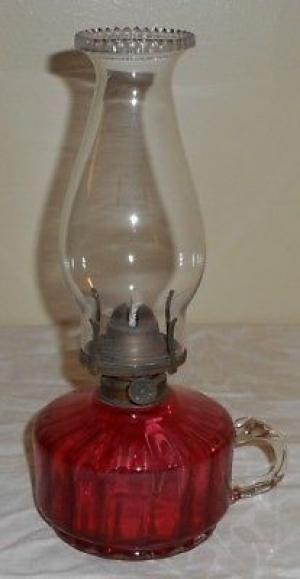 Pretty Cranberry Red Glass Applied Finger Handle Oil Lamp Complete Ready to Use!