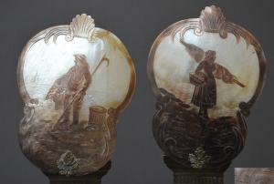 PAIR DECORATIVE BELGIAN OSTENDE MOTHER OF PEARL LITOPHANIES FISHERMEN FISHING