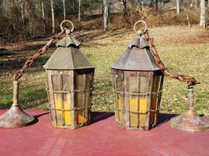 Antique copper Arts And Crafts Glass Hanging lamp w/ ceiling flange pair