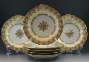 19C Ahrenfeldt French Limoges 7 Scalloped Gilt Fan Edge Soup Bowls Art Nouveau