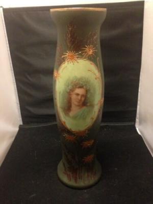 LG 19th Hand Painted and Gold Gilt Glass Portrait Vase of a Beautiful Woman 15"