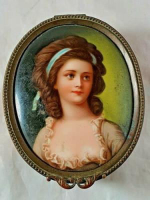 FRENCH BRASS JEWELRY BOX W/ SIGNED PORCELAIN PORTRAIT IN LID - 1780- 1830 - FINE