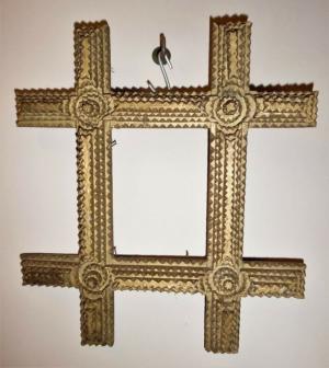Antique TRAMP ART folk art crossed corner picture frame in old mellow gold paint