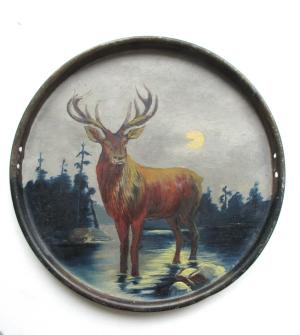 Antique STAG BY MOONLIGHT Original Deer Oil Painting Old Tin Lid BOUNDARY WATERS