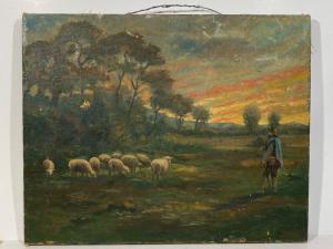 Antique Fine Sheep Herder Shepard Sunset Landscape Oil Paintin