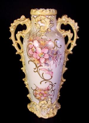 Tall Victorian Porcelain Vase Hand Painted w Flowers by SUHLA, Germany 10 1/2"