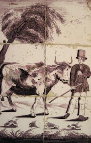 Antique 19th C 6 Wall Tile Painting Ceramic Plaque of Cow Shepherd in Landscape