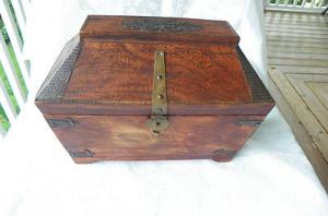 Victorian Style Wooden Tea Caddy Sarcophagus Shape Form Metal Embellishments