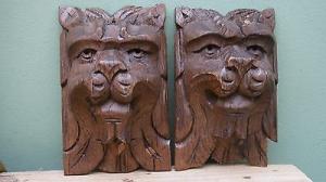 SUPERB Pr 19thc GOTHIC WOODEN OAK CARVED LION HEAD CORBELS