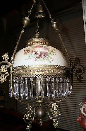 Antique Hanging Parlor Light Fixture / Chandelier With Dangling Cut Crystals
